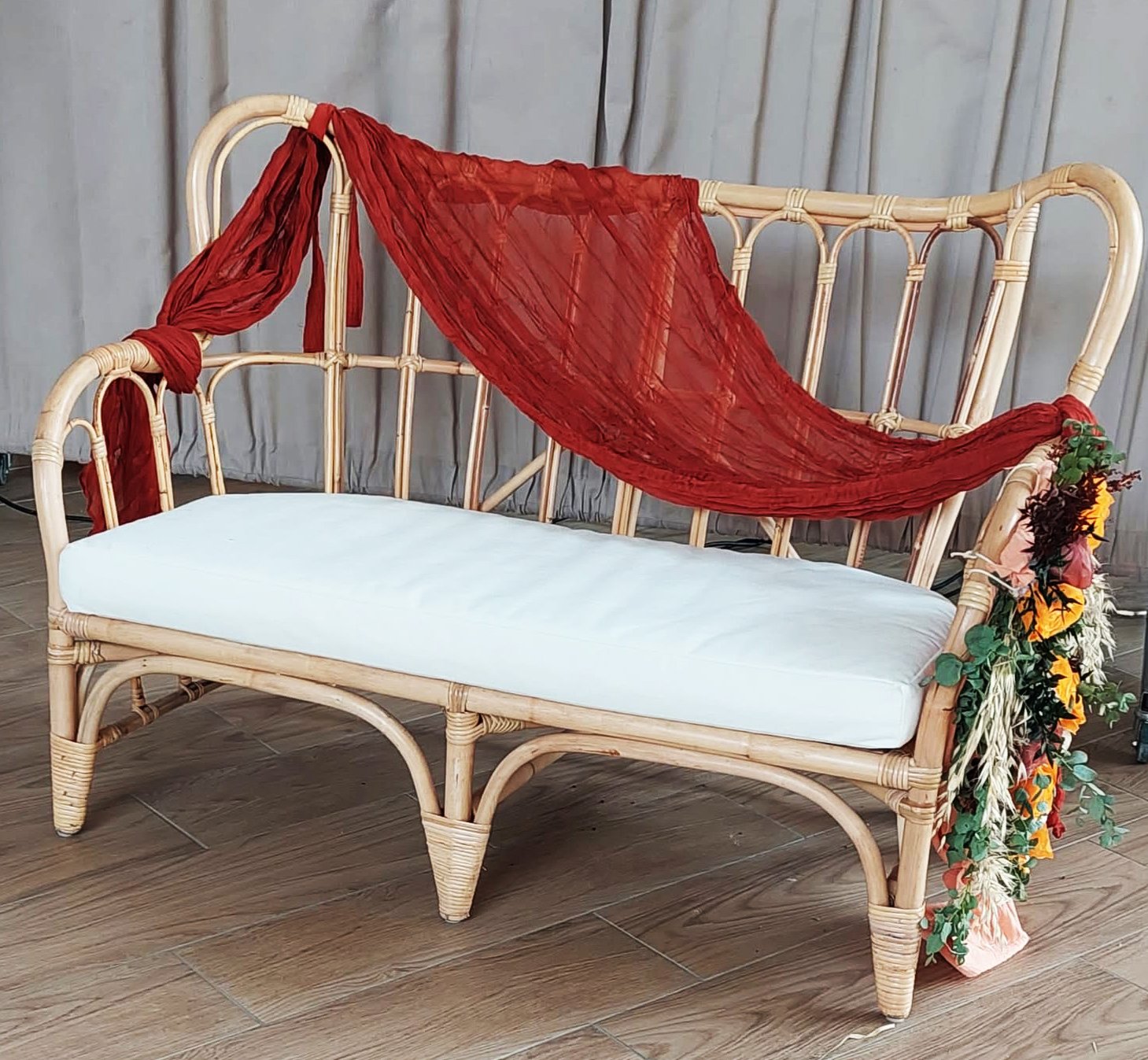 Cette banquette élégante et raffinée pourra être utilisée lors de vos cérémonies. Avec son design épuré, cette banquette saura également trouver sa place dans n’importe quelle décoration de votre événement, pour un coin détente, votre coin livre d’or audio, photobooth… Coussin d’assise inclus.