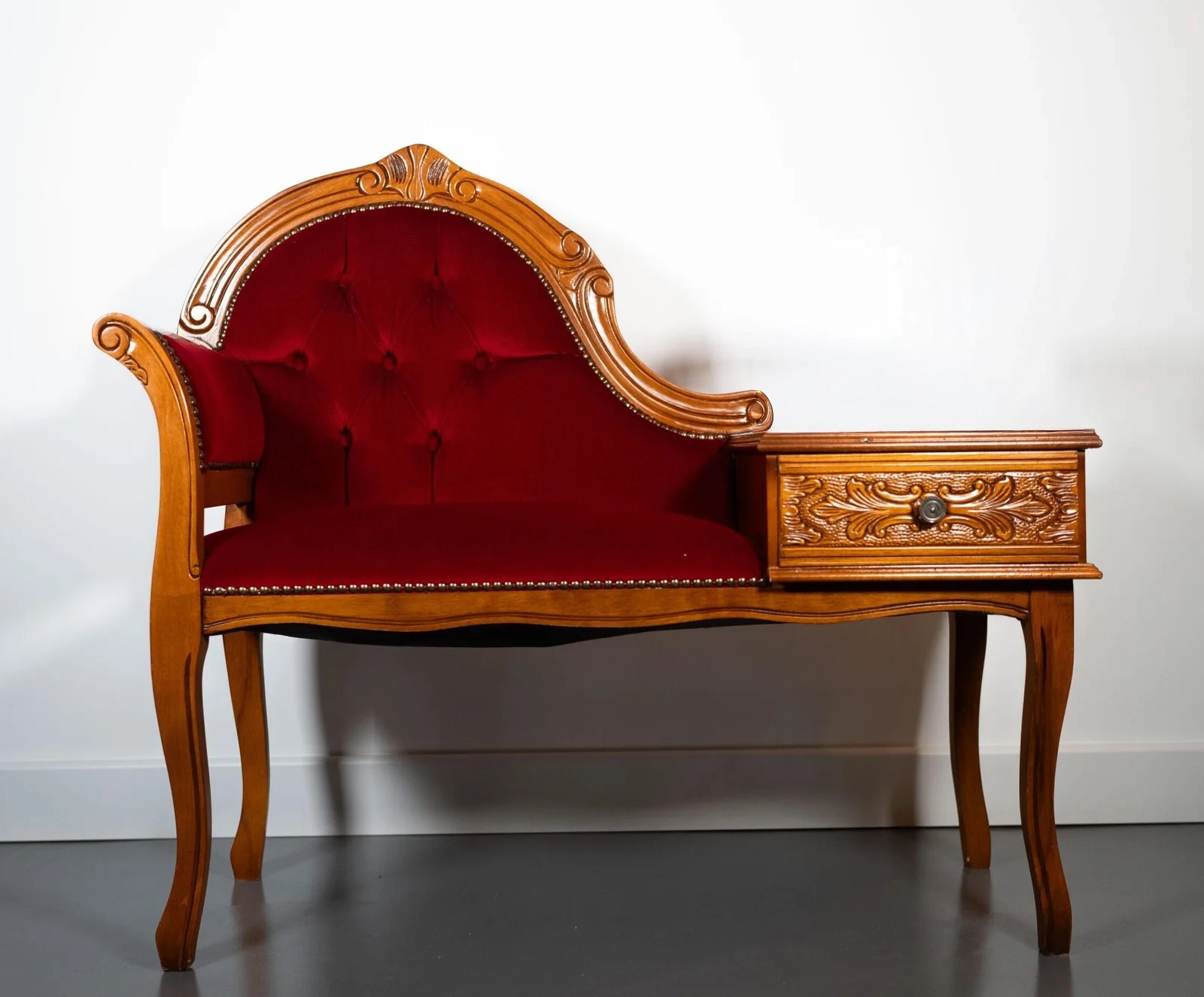 Découvrez notre élégante banquette de téléphone, une pièce unique qui combine l’esthétique intemporelle du bois et le charme vibrant du rouge. Cette banquette est bien plus qu’un simple meuble c’est une invitation à un voyage dans le temps et un élément indispensable pour la décoration de vos animations photobooth ou livre d'or audio...